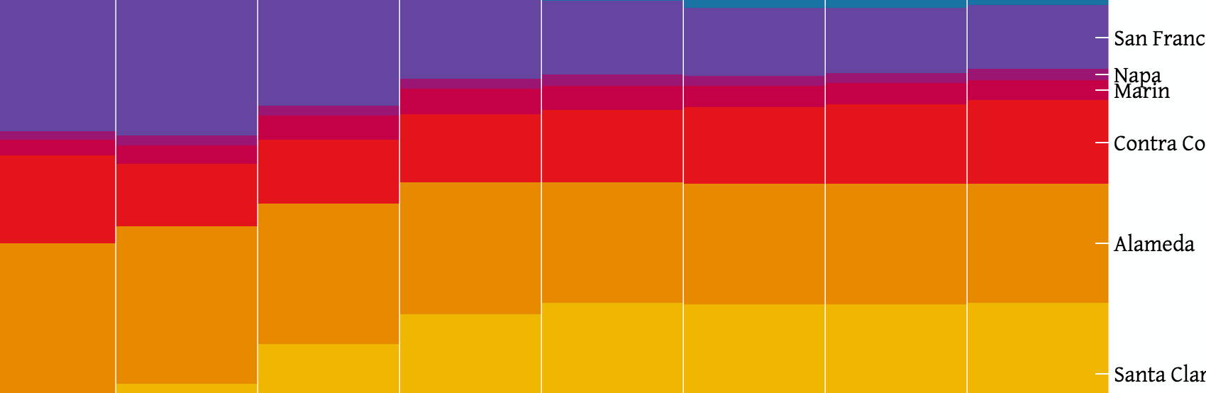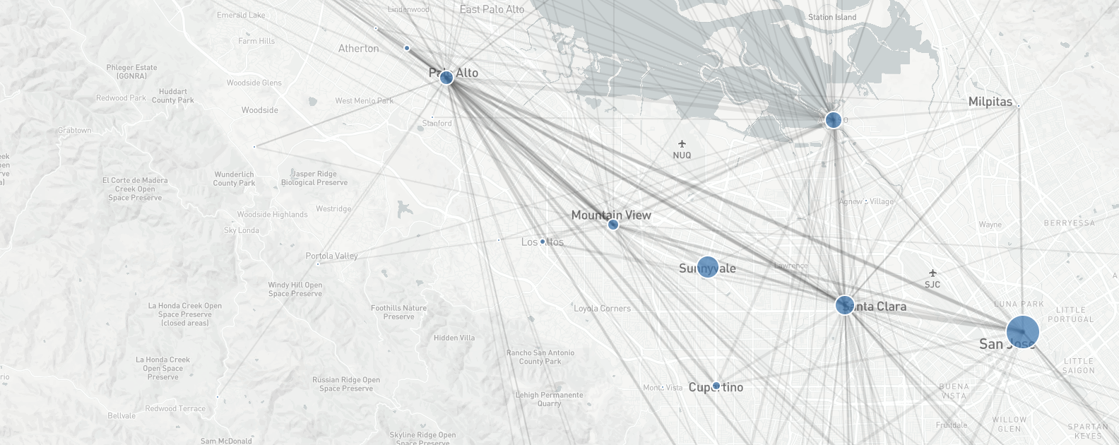A key criticism of conservationists and environmentalists in the Bay Area focused on the massive uptick in traffic that resulted in smog obscuring the views that many residents enjoyed. Here is a snapshot of where people were commuting from in order to visually understand the traffic flow between suburban homes and suburban offices.